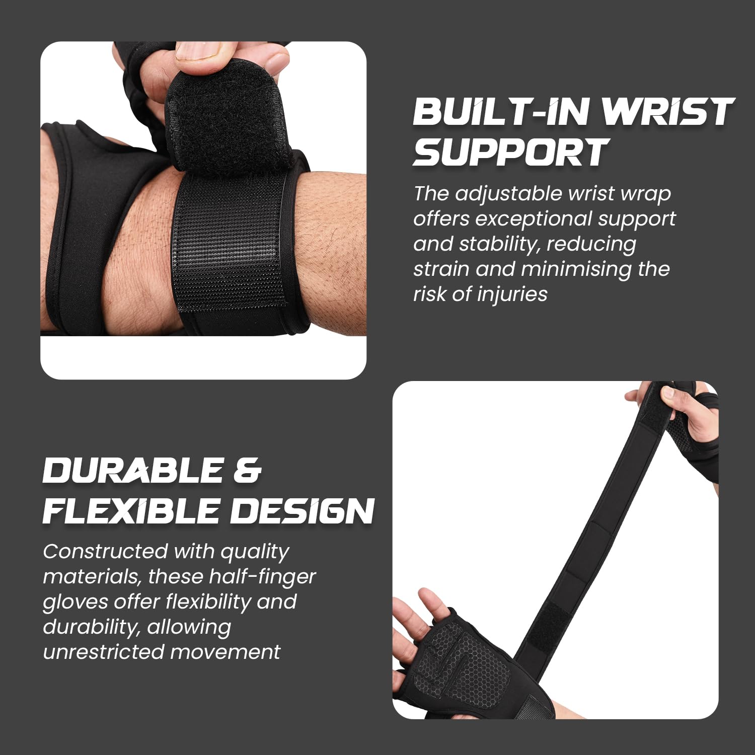 HACER Gym Gloves Weight Lifting Hand Grips with Wrist Wrap Support Half Finger Crossfit Glove for Workout Exercise Fitness Training Powerlifting Men and Women (Pack of 1, Black)