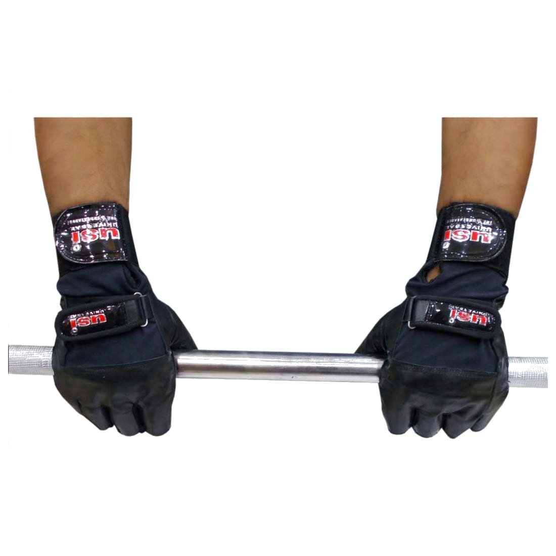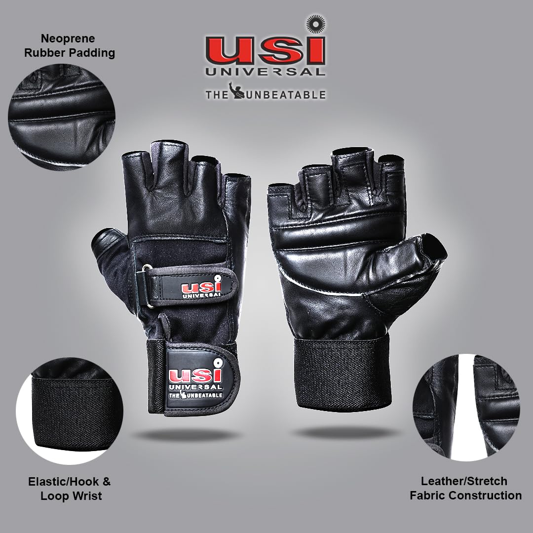 USI UNIVERSAL Gym Gloves, 733GG Fitness Gloves For Men & Women, Workout Powerlifting Gloves, Leather/stretch Fabric Construction, Neoprene Rubber Padding Weight Lifting Gloves (Small, Black)