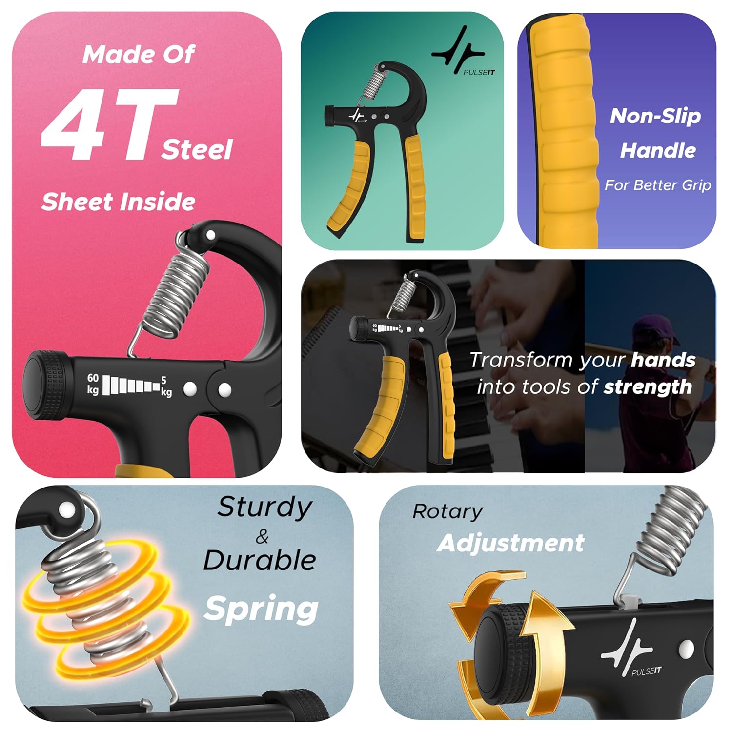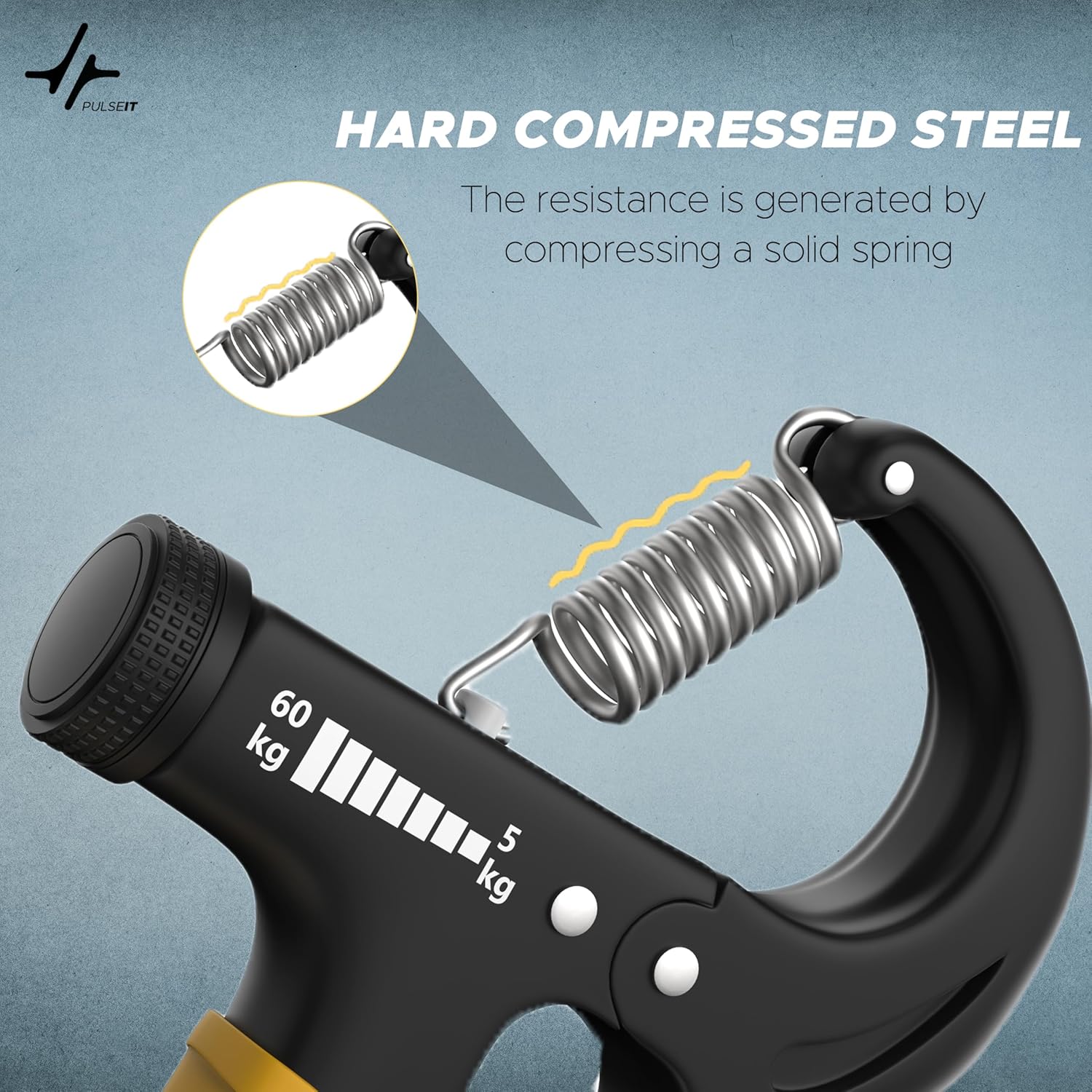 Adjustable Resistance for Custom Grip Strength Training : The Pulseit hand gripper offers adjustable resistance ranging from 5 to 60 kg, allowing you to tailor your workout to your specific needs. Suitable for athletes, sports enthusiasts, fitness trainers, musicians, and anyone looking to strengthen their hand, wrist, and fingers. Its easy-to-use resistance adjustment makes it ideal for both beginners and experienced users, regardless of gender or strength level.
