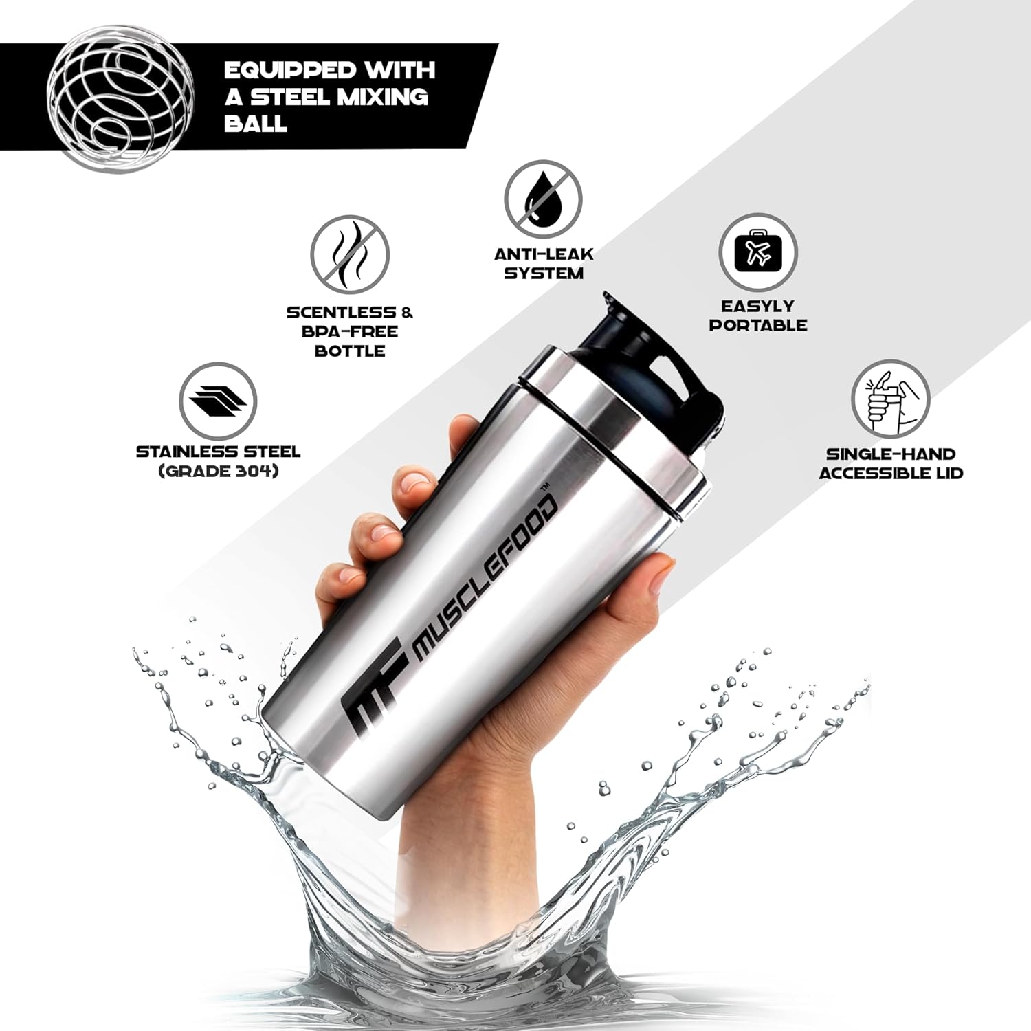 Crafted from durable stainless steel, Musclefood steel shaker offers long-lasting performance.