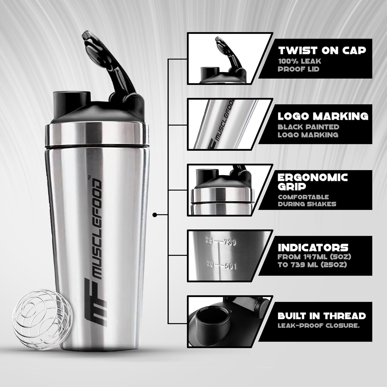 Durable, Easy to Clean, and Stylish: Musclefood Gym Shaker features a 750ml capacity, leak-proof cap, and rounded corners for hassle-free cleaning. It’s made from 100% stainless steel, designed for bold fitness enthusiasts like you.