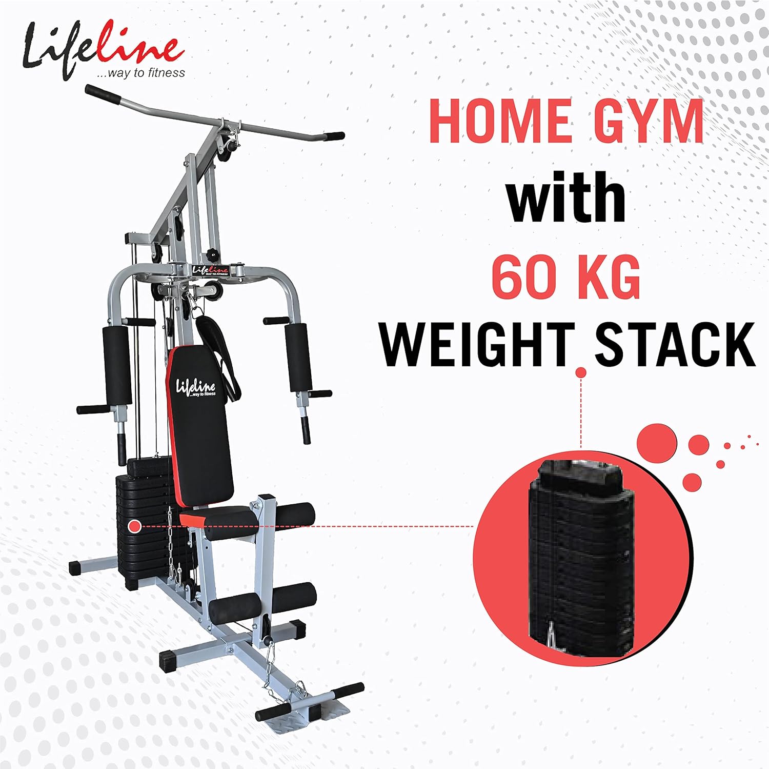 The weight stack of the home gym has 12 plates of 5kg each (Total Weight: 60kg). The total weight of the machine is 110 kg.