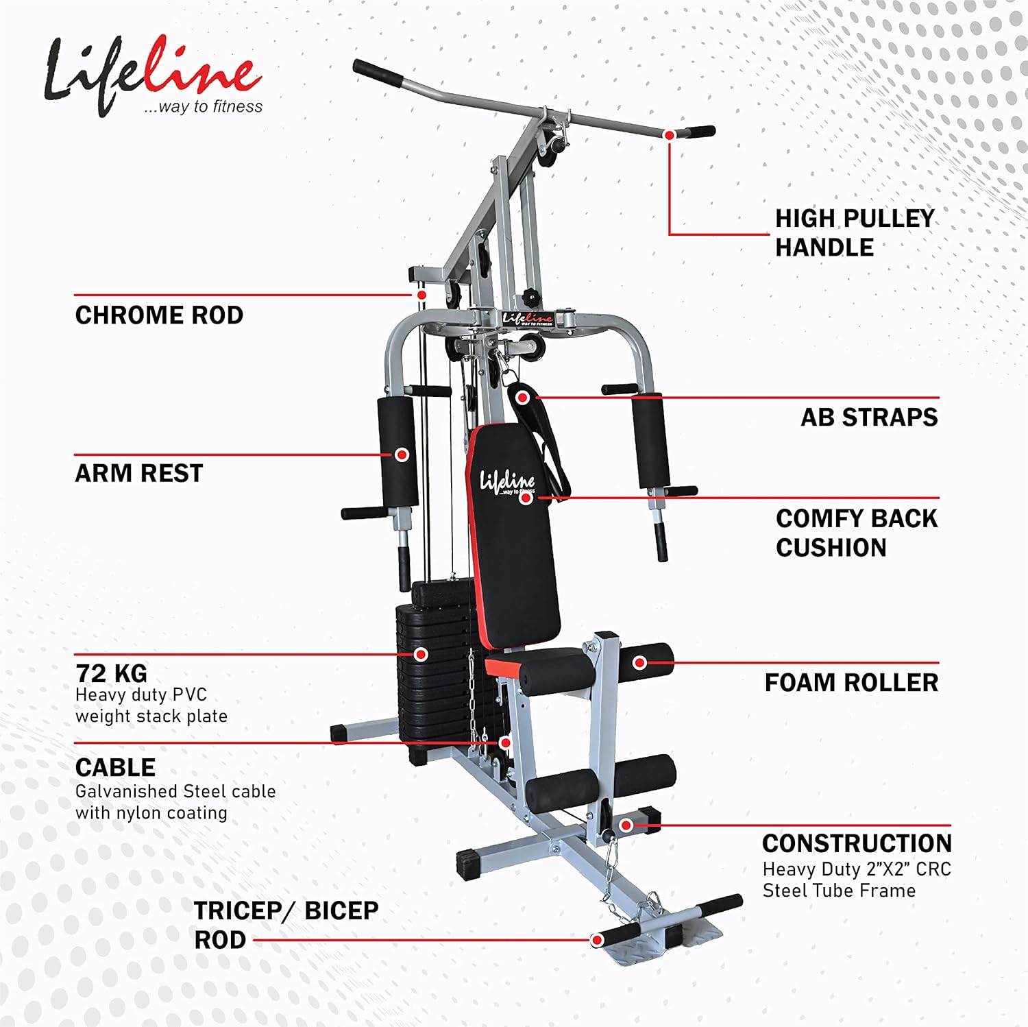Lifeline Multipurpose Home Gym HG-009 has a 2 inches heavy duty square frame construction of CRC Steel Tube. The powder coating on the gym frame provides strength and durability to the product.
