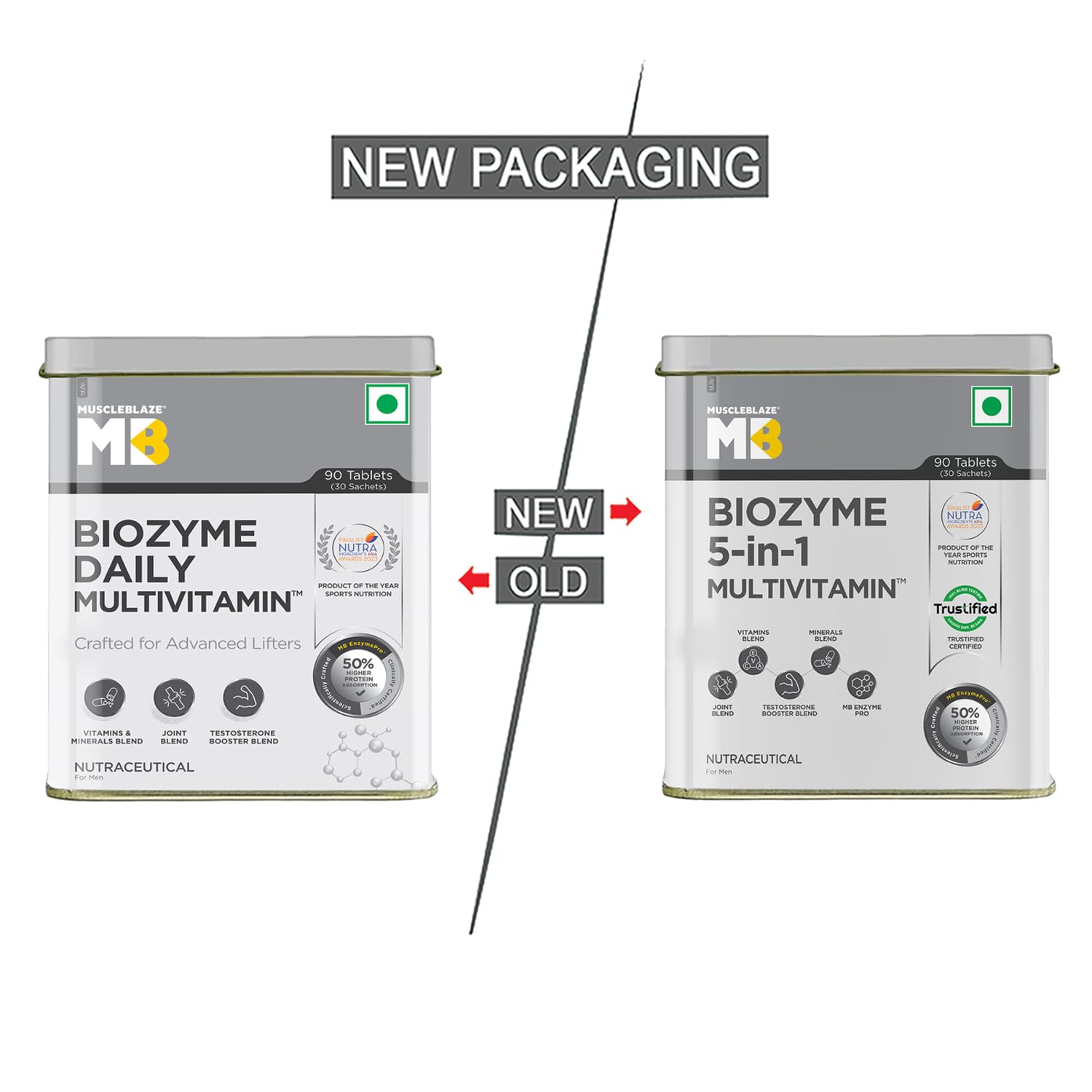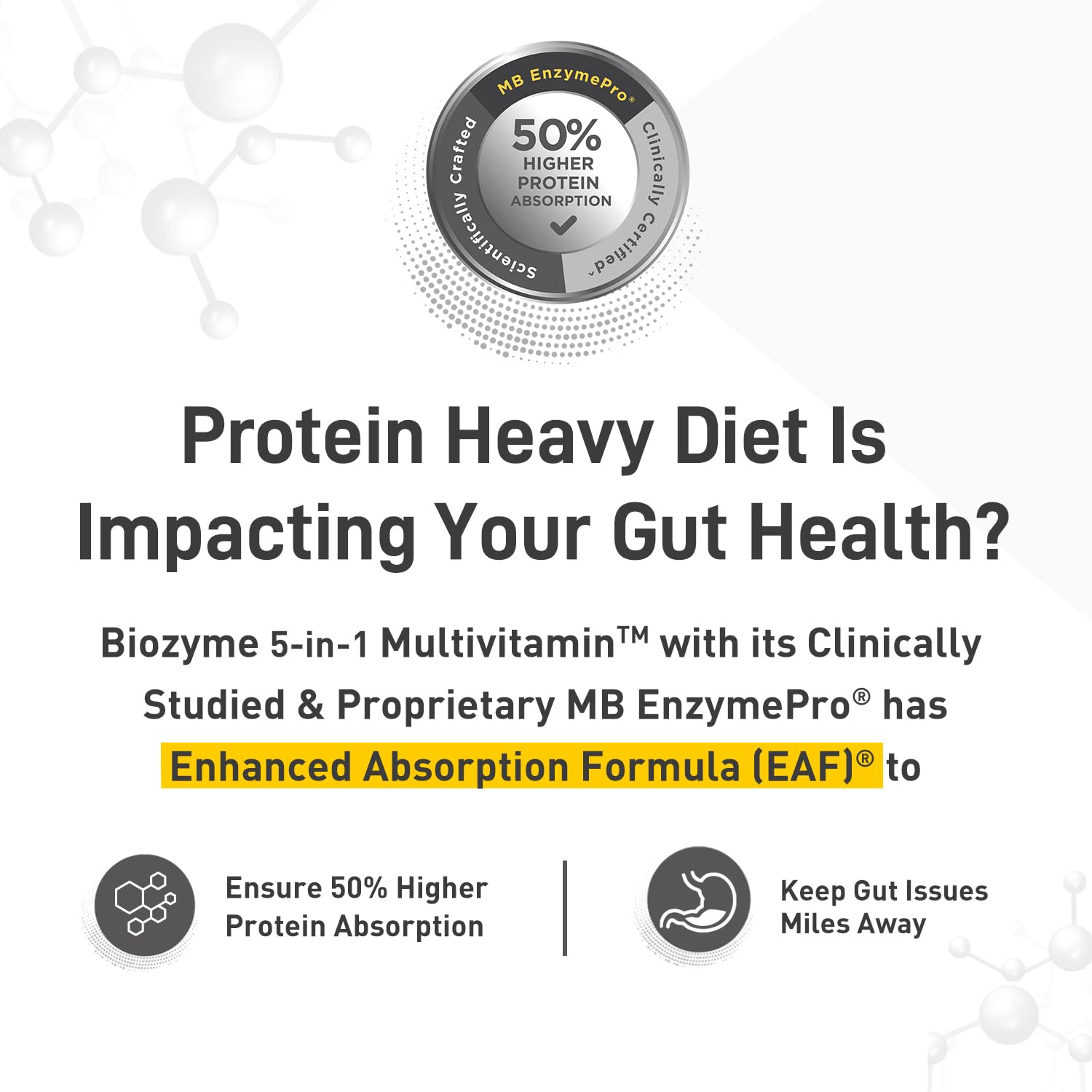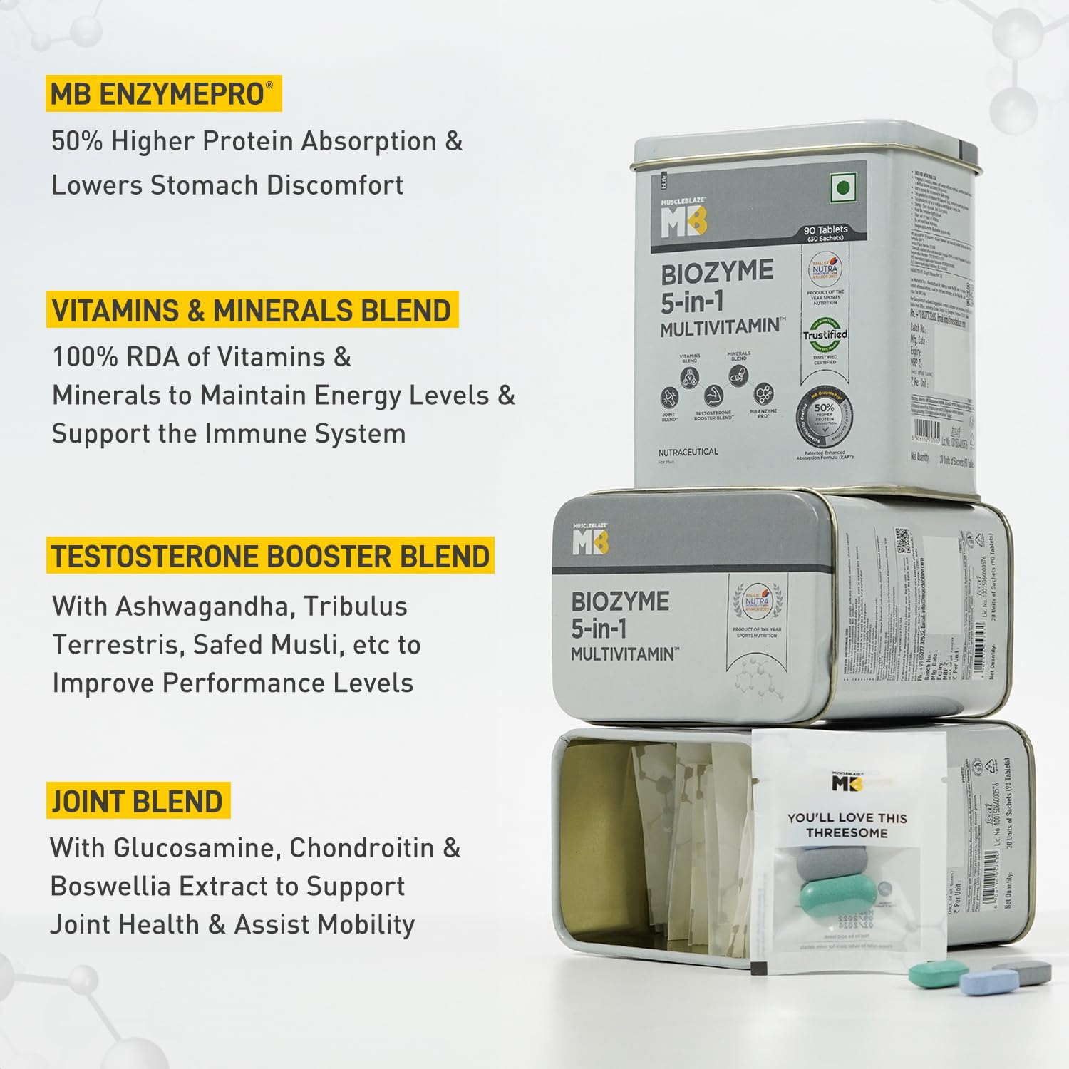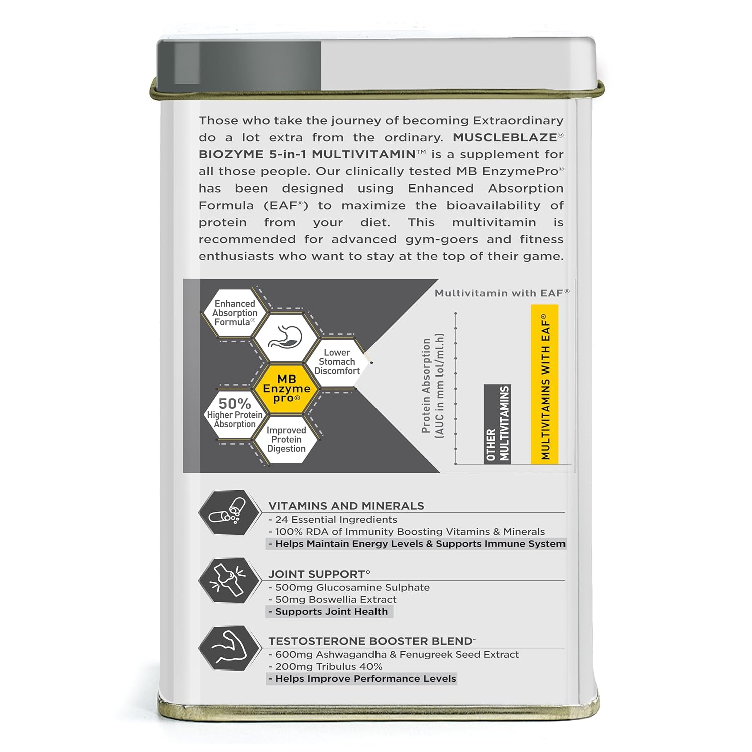 POWER OF BIOZYME: MuscleBlaze Biozyme 5-in-1 Multivitamin is more than just a multivitamin with our proprietary and clinically tested MB EnzymePro that has Enhanced Absorption Formula (EAF) to ensure 50% higher protein absorption and keep stomach issues miles away