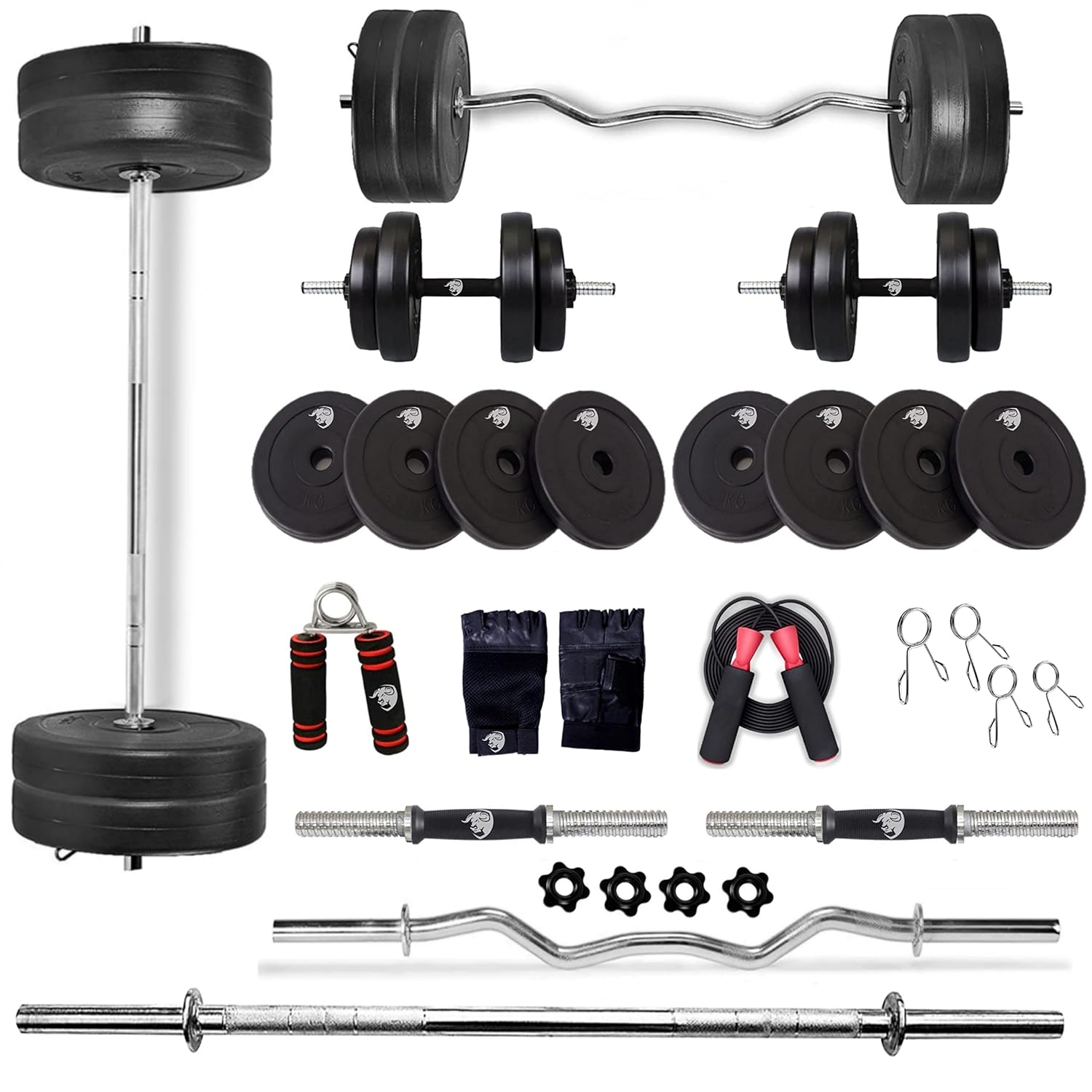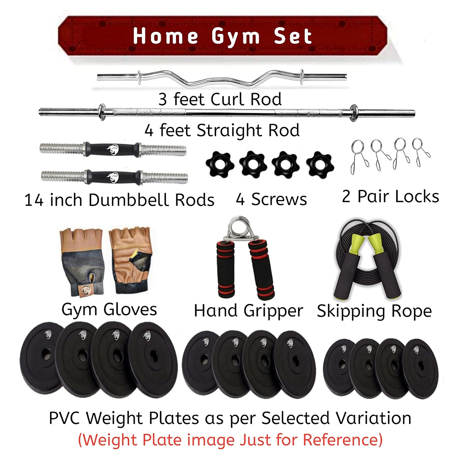 In-Box Contents: 8 kg of PVC weight Plate (2 kg x 4 = 8 Kg), 1 x 3 feet curl rod + 1 X 4 Feet straight rod + 1 Pair 14-inch Dumbbell Rods, 2 x 14-inch dumbbell rods 1 skipping rope 1 hand grip 1 pair Lock and 1 Pair Gym Gloves