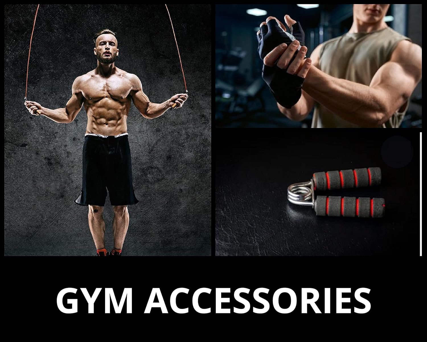 Gym Accessories: Gym gloves + 1 Skipping Rope + 1 Hand Gripper + 4 dumbbell rod nuts and 2 spring locks with rods