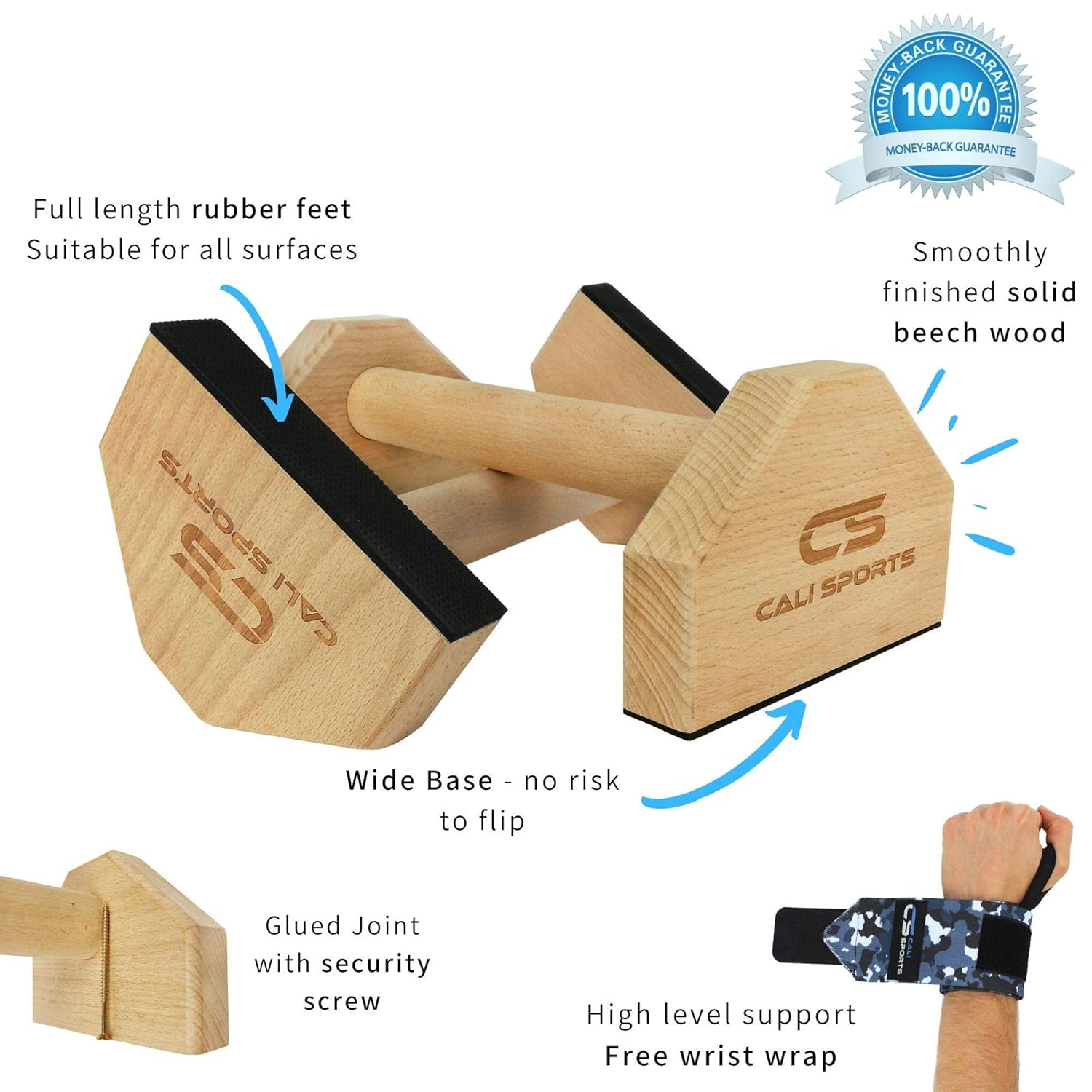 COMFORT AND BALANCE – Are absolute key to your wrists. You need to feel confident with your equipment in order to fully focus on your performance. Thanks to the wide base and ergonomic handles in smooth finish, these parallettes will be a joy to hold. Additionally, our FREE WRIST WRAPS will improve the level of support to imobilize your wrists, totally avoiding any pain or risk of injury.