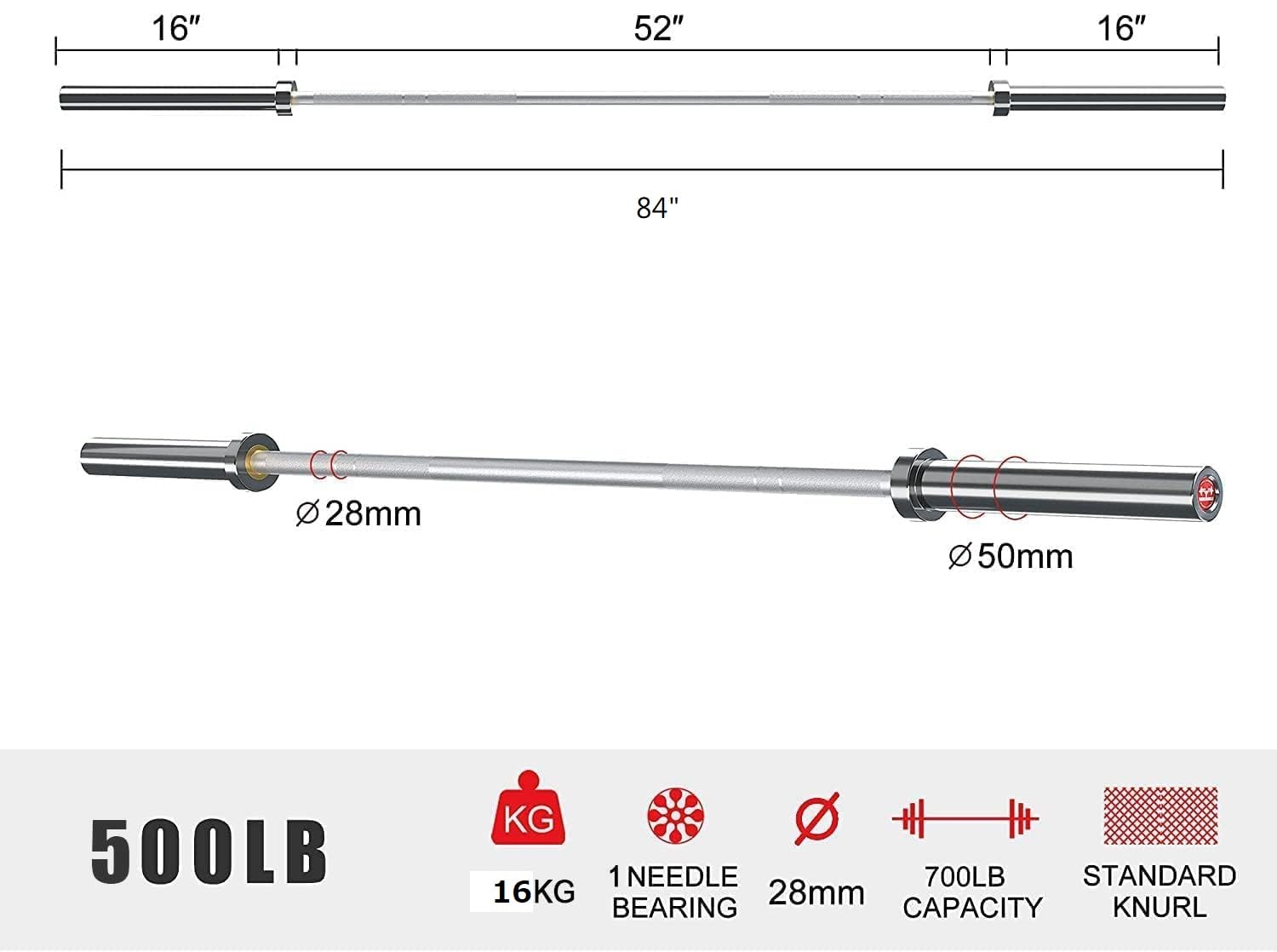SUPERIOR SPECS-190,000 PSI tensile strength steel.The length of the Olympic bar is 86 inches (7-feet), a solid 16 kg,28 mm diameter. Konark olympic barbell lifting gym rod can hold 400kg weight capacity, has the characteristics of high load-bearing capacity and flexibility,coated with a cutting-edge vibrant,yet corrosion-resistant powder coating that will last you a lifetime