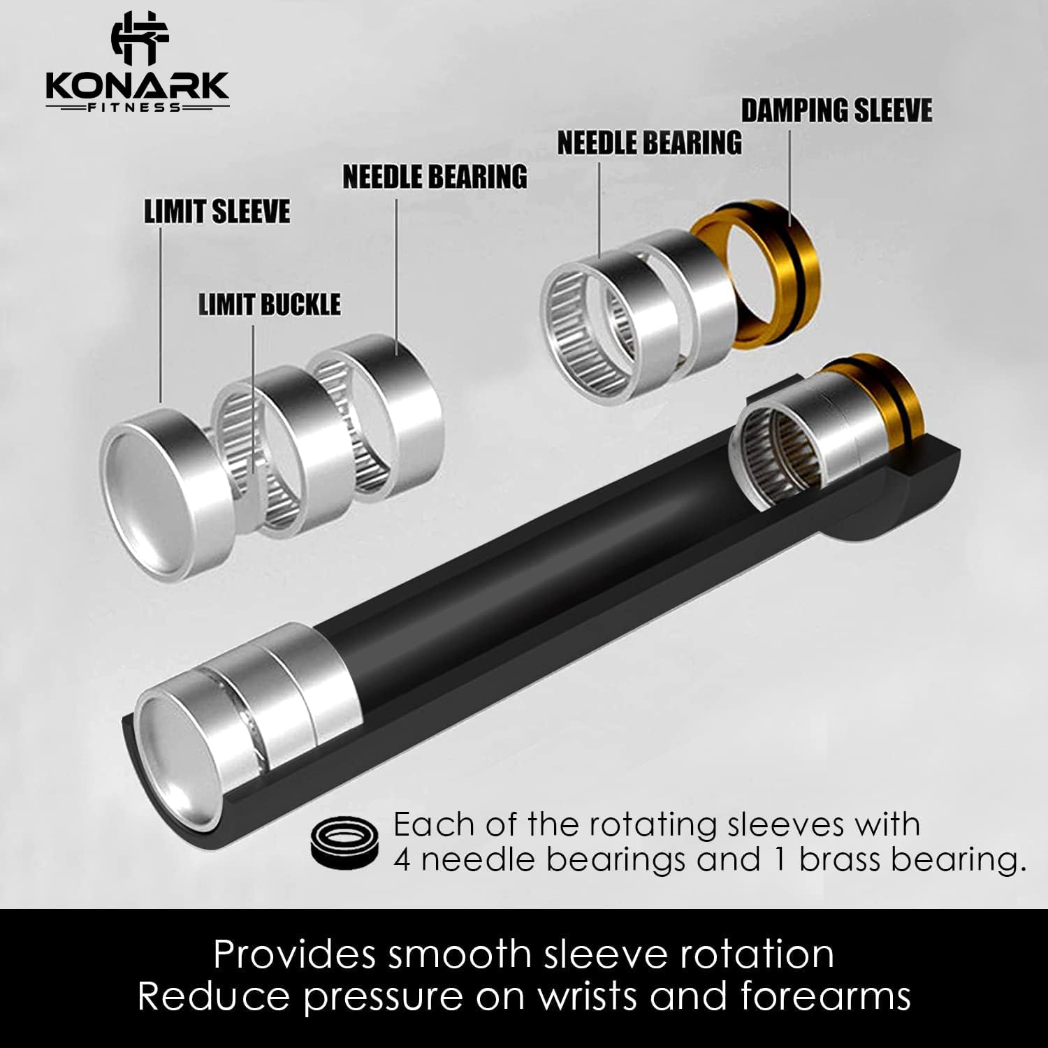 NEEDLE BEARING & SLEEVES:The sleeves of barbells are often constructed with either bushings or bearings. Konark Olympic barbell sleeves are friction welded, it’s stronger than normal welding sleeves. Each of the rotating sleeves with 4 needle bearings and one bushing, totally 8 needle bearings in the bar. Bushings provide a comprehensive smooth spin, bearings on the other hand are designed to spin fast and match the catching needs of the snatch and clean & jerk