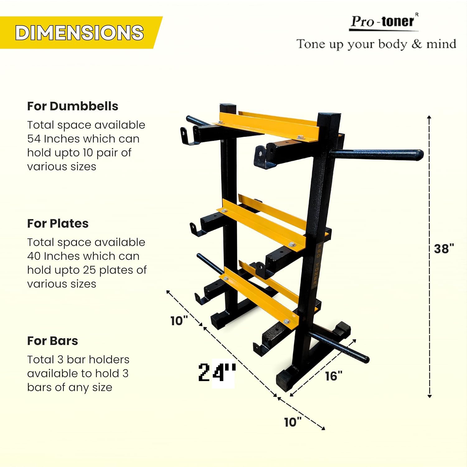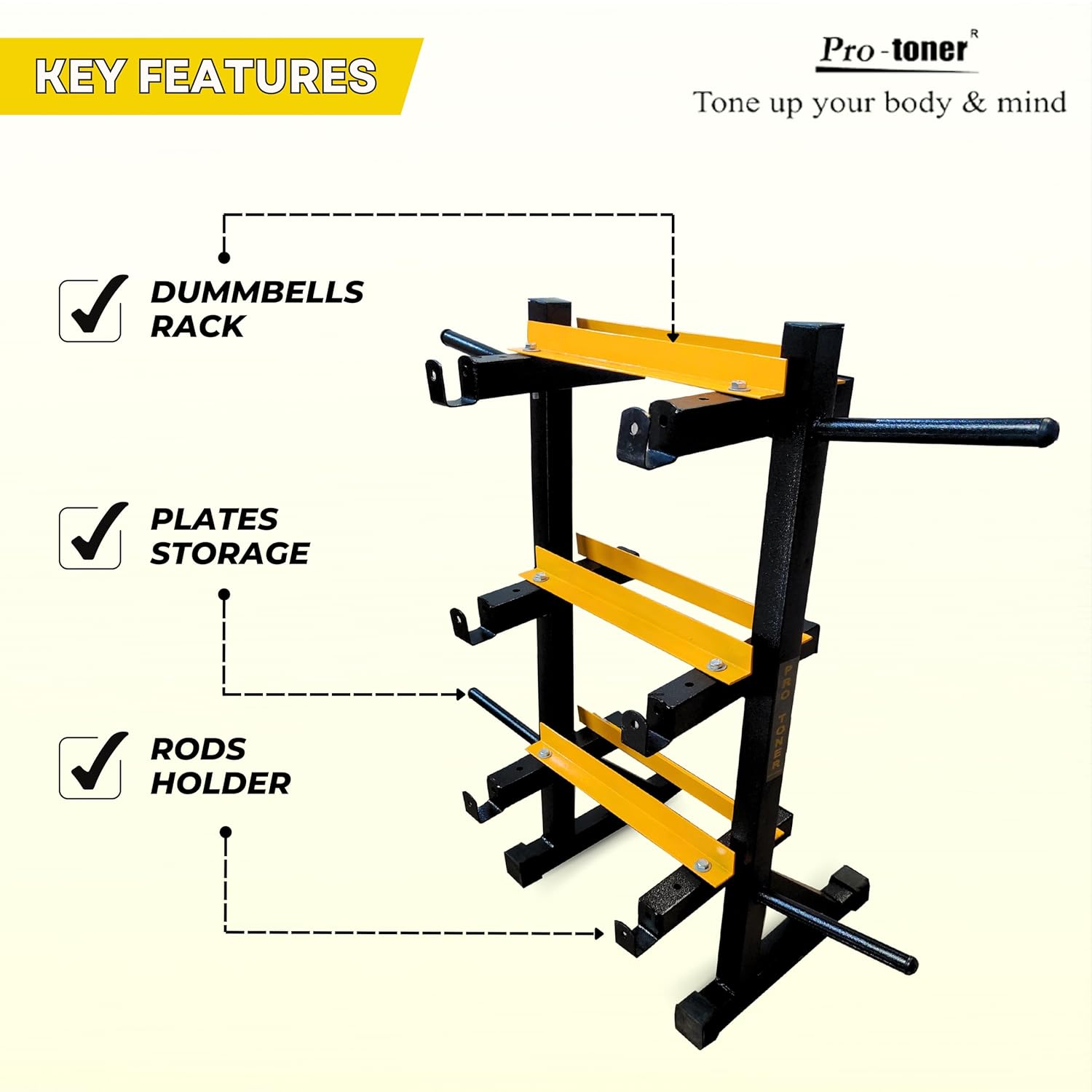 Protoner 3 in 1 Dumbbell Rack, Plates Tree and Rod holder,Specially designed for customers who have in house gymThis rack serves 3 purposes providing storage of bars, dumbbells and rods.Max capacity 400 kgs, Plates, Rods and Dumbbells are not included.
