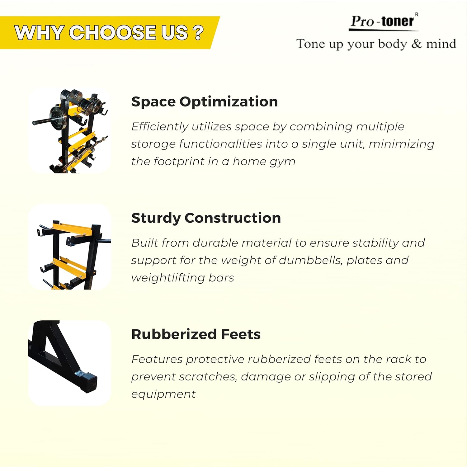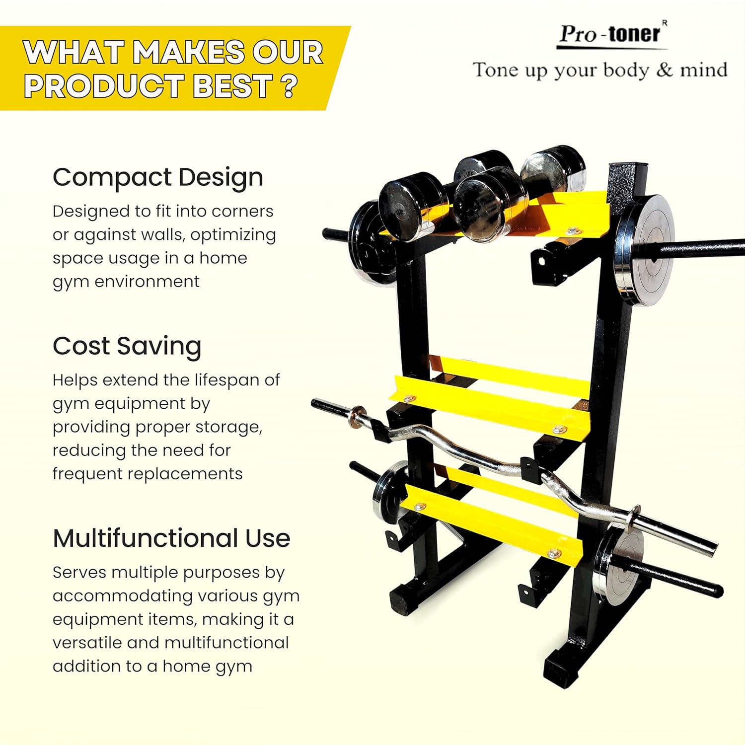 Protoner 3 in 1 Dumbbell Rack, Plate Stand and bar Holder (Black and Yellow)