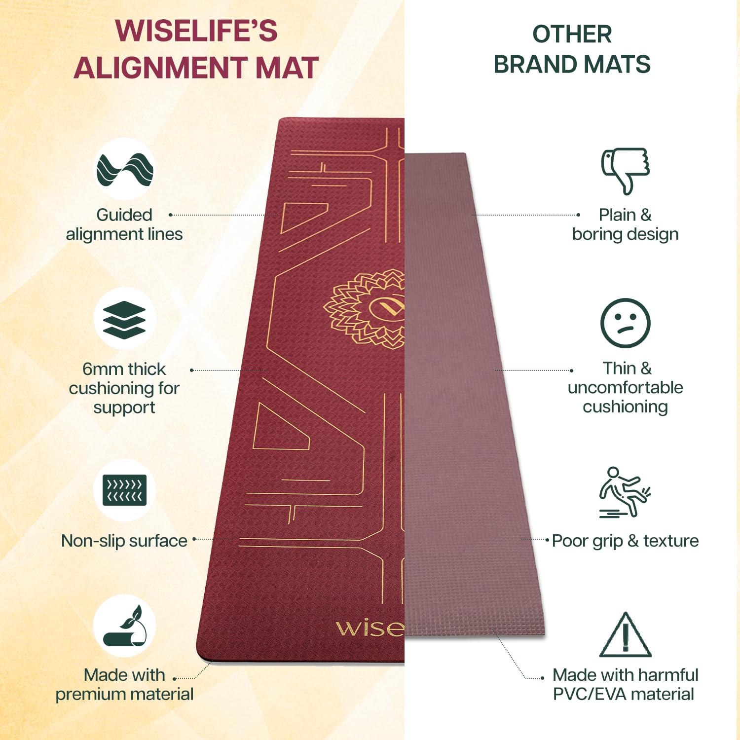Wiselife Tru Body Alignment Yoga Mat + Sleek Yoga Strap For Men And Women | Non-Slip Textured Extra Wide & Thick | Pro Balance Tpe Exercise Mat For Home, Pilates, Gym & Fitness (6MM, Wine)